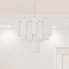 The Amalia Murano Frosted Glass Tubes Chandelier by SMITH&SMITH brings elegance with misty white glass panels in a multi-tiered look. The frosted look gives a calm feel as it diffuses lights. This luxurious piece can blend well into minimalist or contemporary spaces.