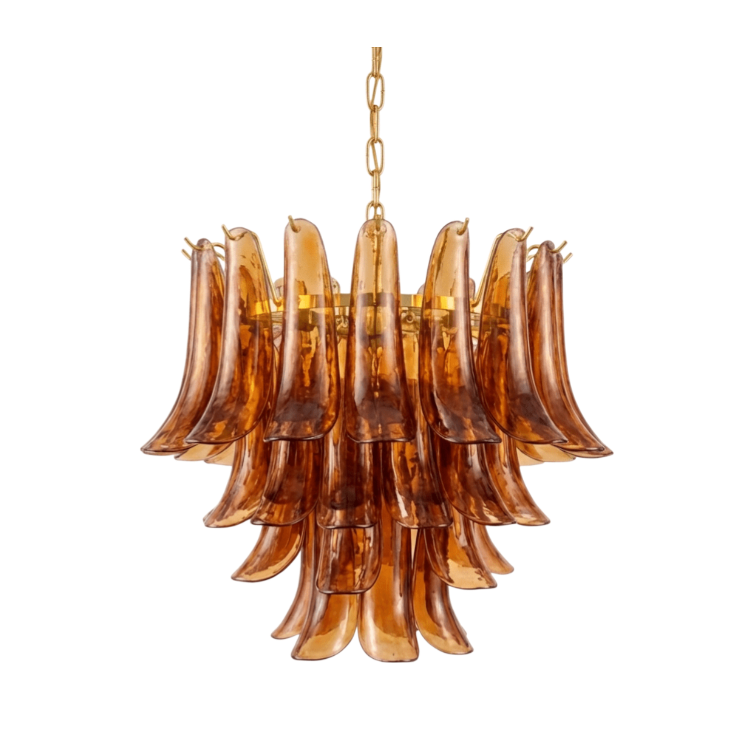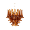 The Anete Emberwave Murano Chandelier by SMITH&SMITH features layered amber glass shaped in soft, flowing curves. It gives off a warm, glowing light. A beautiful statement piece for dining rooms or entryways. Available in brass, nickel and selected other finishes. Contact us for more information.