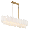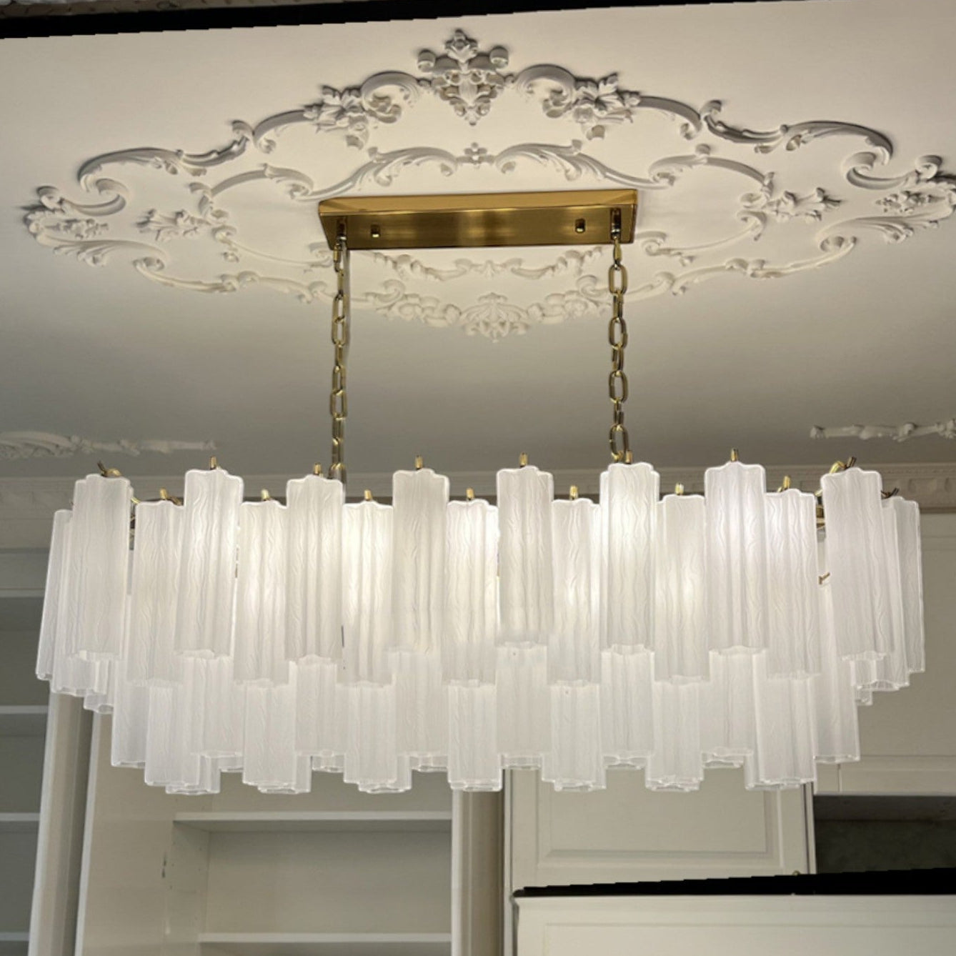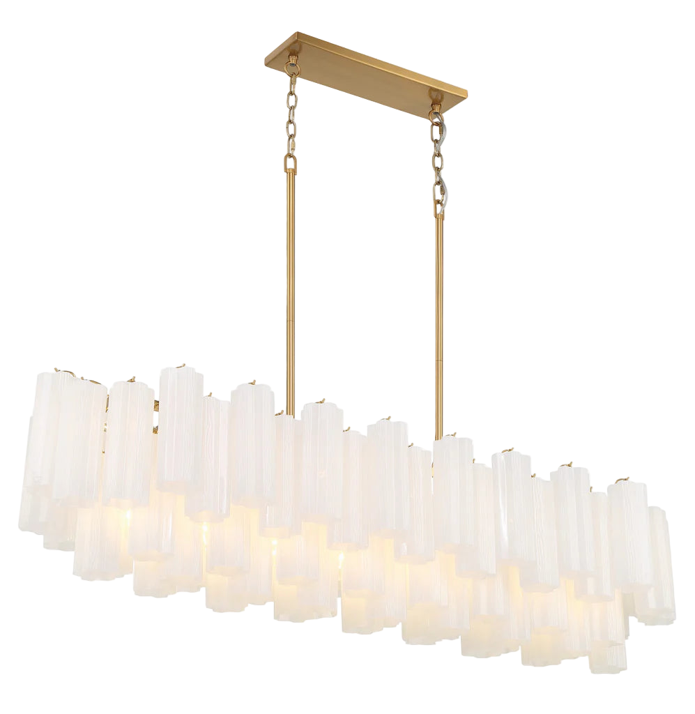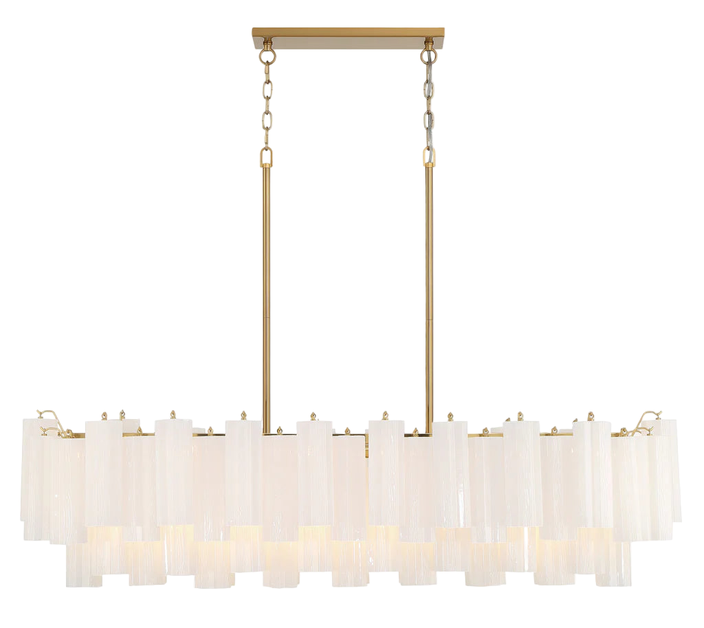 A stunning multi tier glass linear chandelier made-to-order for your needs in a variety of glass colours and metal finishes. We can cater for every ceiling type, and suspend by fixed rod or adjustable chain. Contact us about different lengths in this style too!