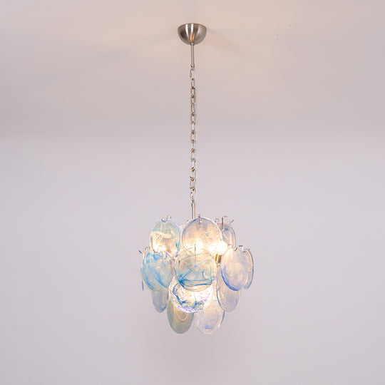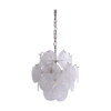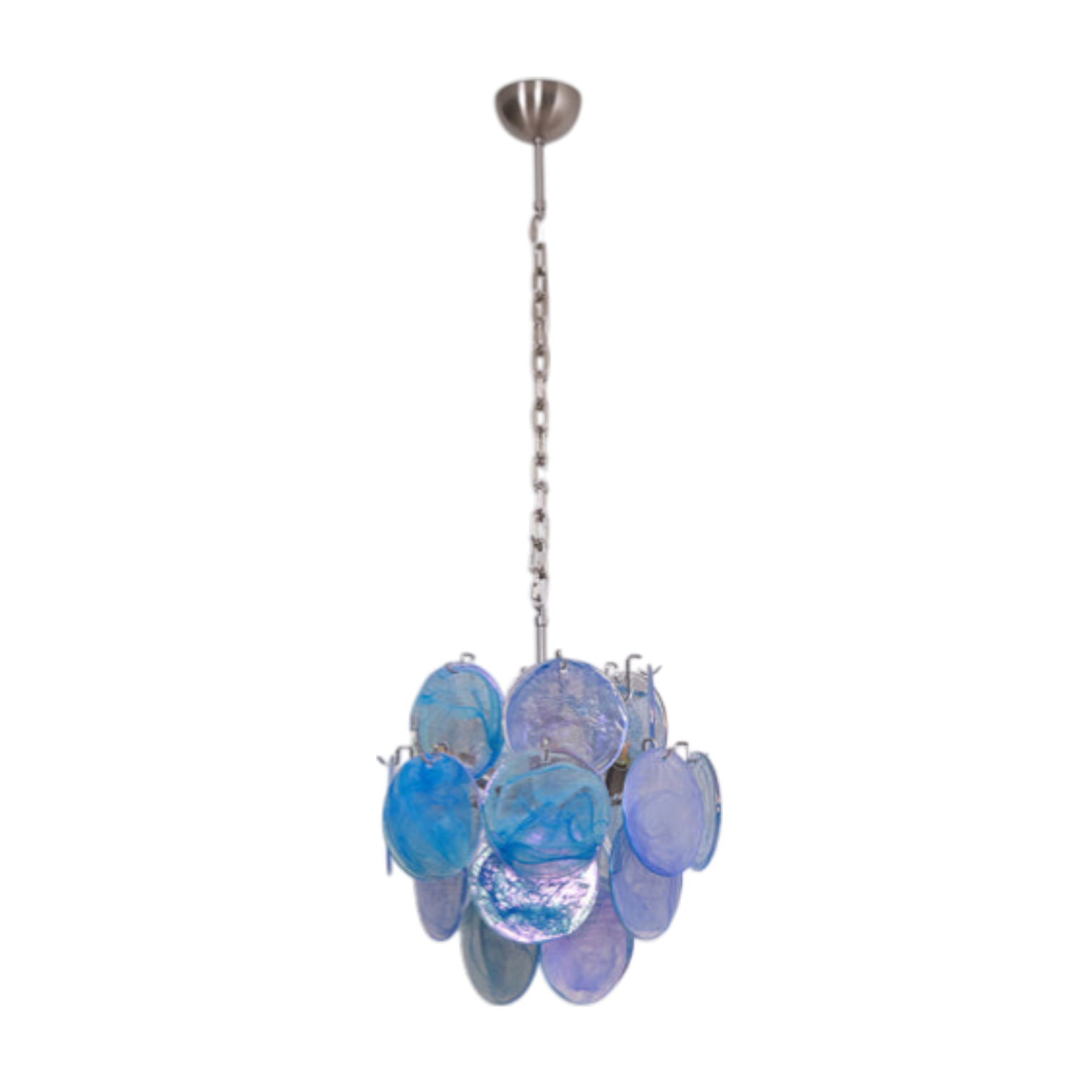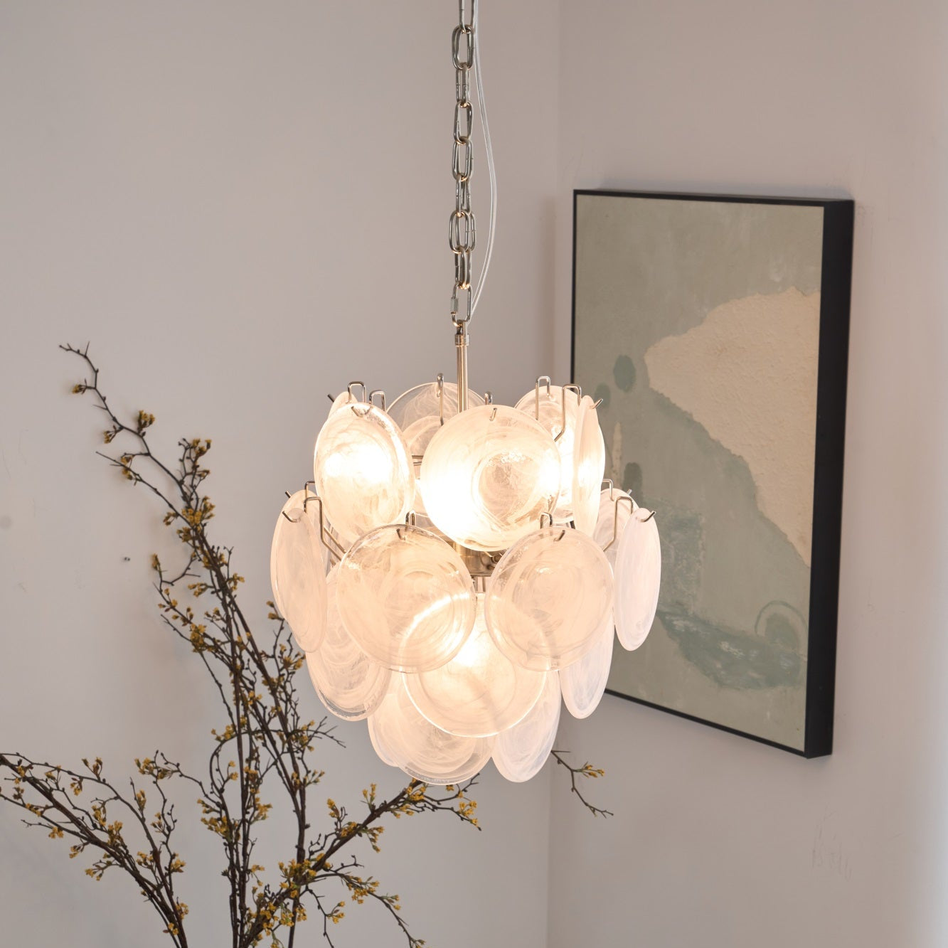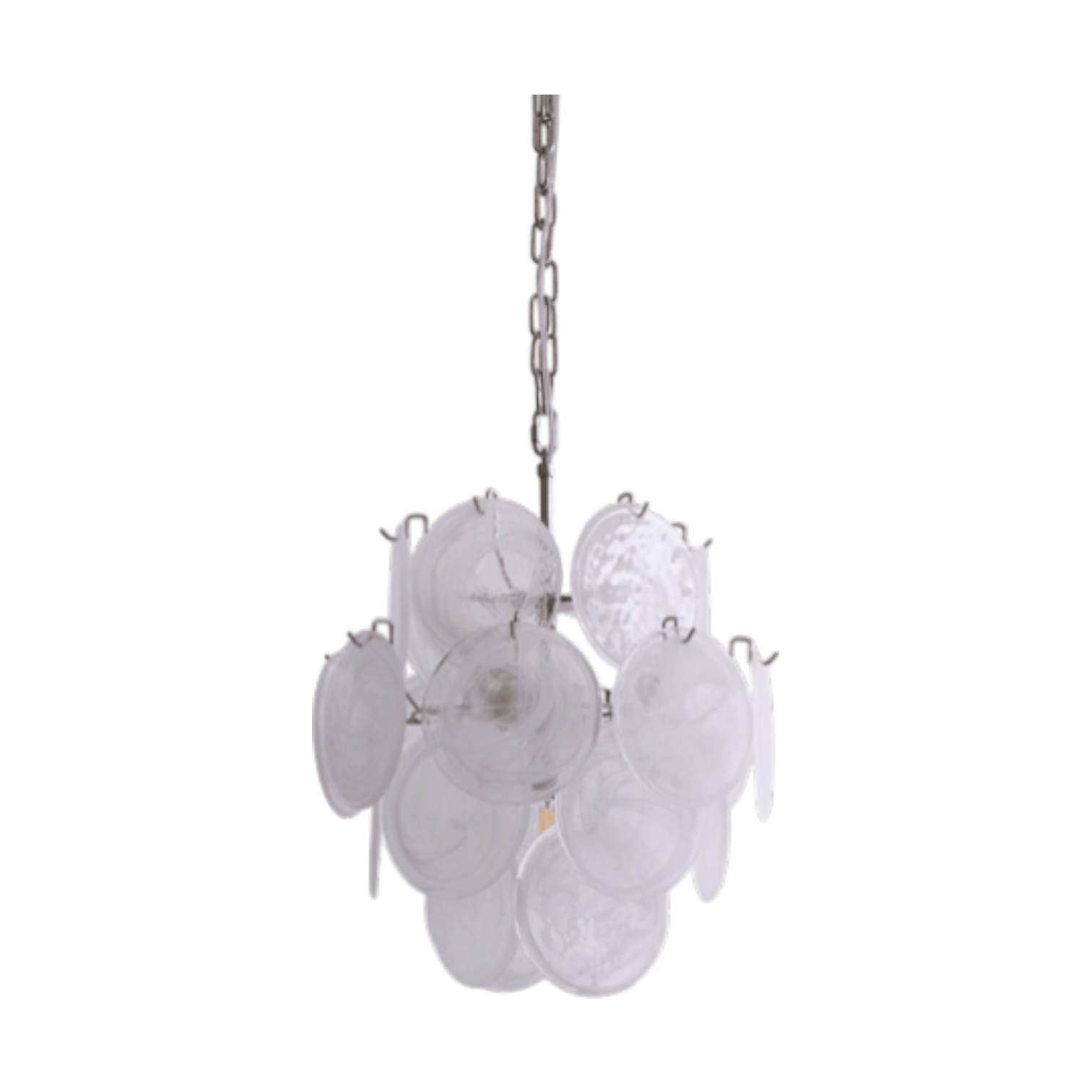 The Giacinta Glass Murano Chandelier by SMITH&SMITH features handcrafted glass discs in a soft, flowing design. It creates a light glow and adds a timeless feel to living and dining spaces. Available in brass, nickel and selected other finishes. Contact us for more information.