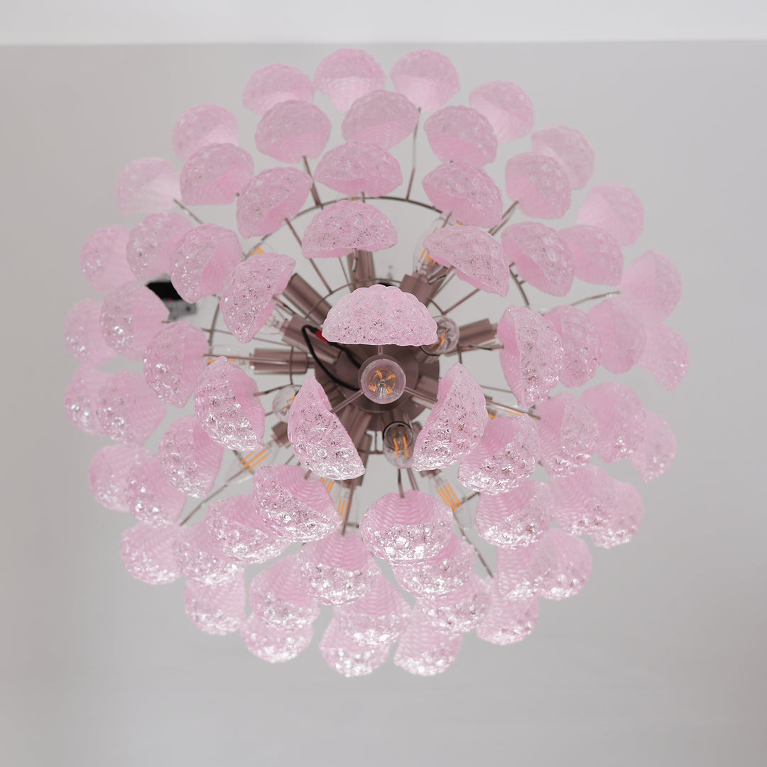 The Caterina Murano Pink Glass Droplet Chandelier by SMITH&SMITH features meticulously crafted Murano glass with intricate diamond textures. Formed in the shape of droplets, which brings charming elegance, perfect for glamorous dining areas, chic hotels, or refined living spaces.