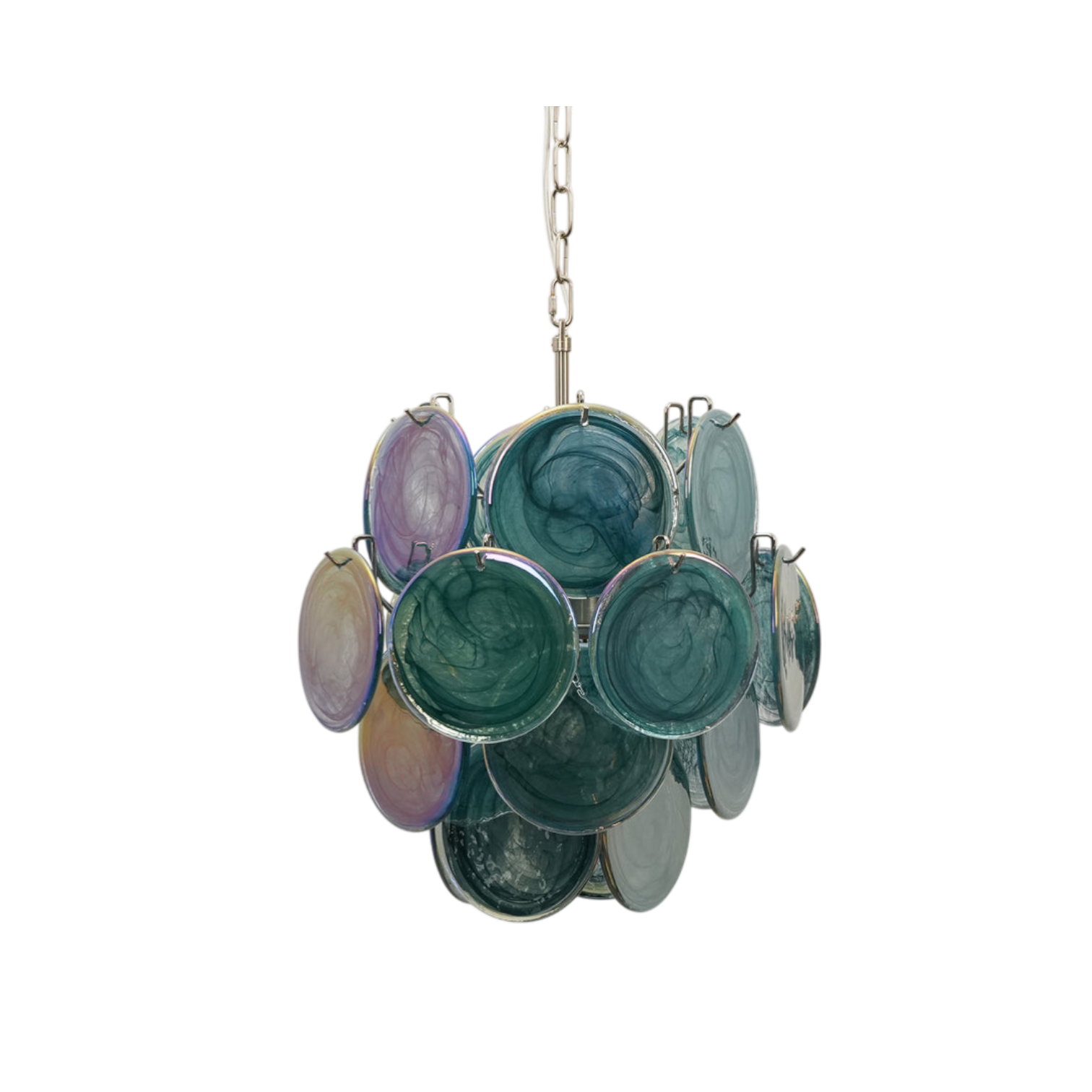 The Elisa Disc Murano Chandelier by SMITH&SMITH features beautifully handcrafted Murano glass in the form of discs swirling with delicate pigment and organic texture. The iridescent form casts a dreamy feel into any room or gallery of elegance.