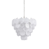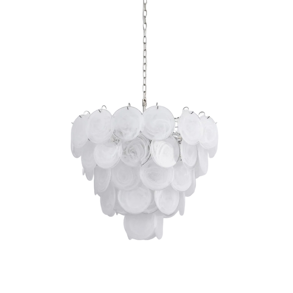 The Florenzia White Murano Disc Chandelier by SMITH&SMITH features elegant white glass discs that combine contemporary design with classic craftsmanship. The warm glow of this piece adds sophistication and warm ambience to any space.