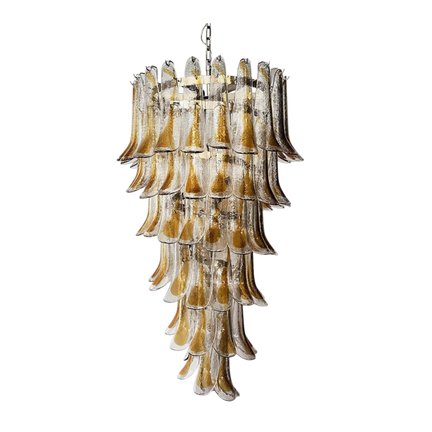 The Galilea Murano Chandelier by SMITH&SMITH features the combination of rustic charm with luxury and tiers of golden glass petals. The petals catch lights with elegance, ideal for any spaces looking for elegance and sophistication.