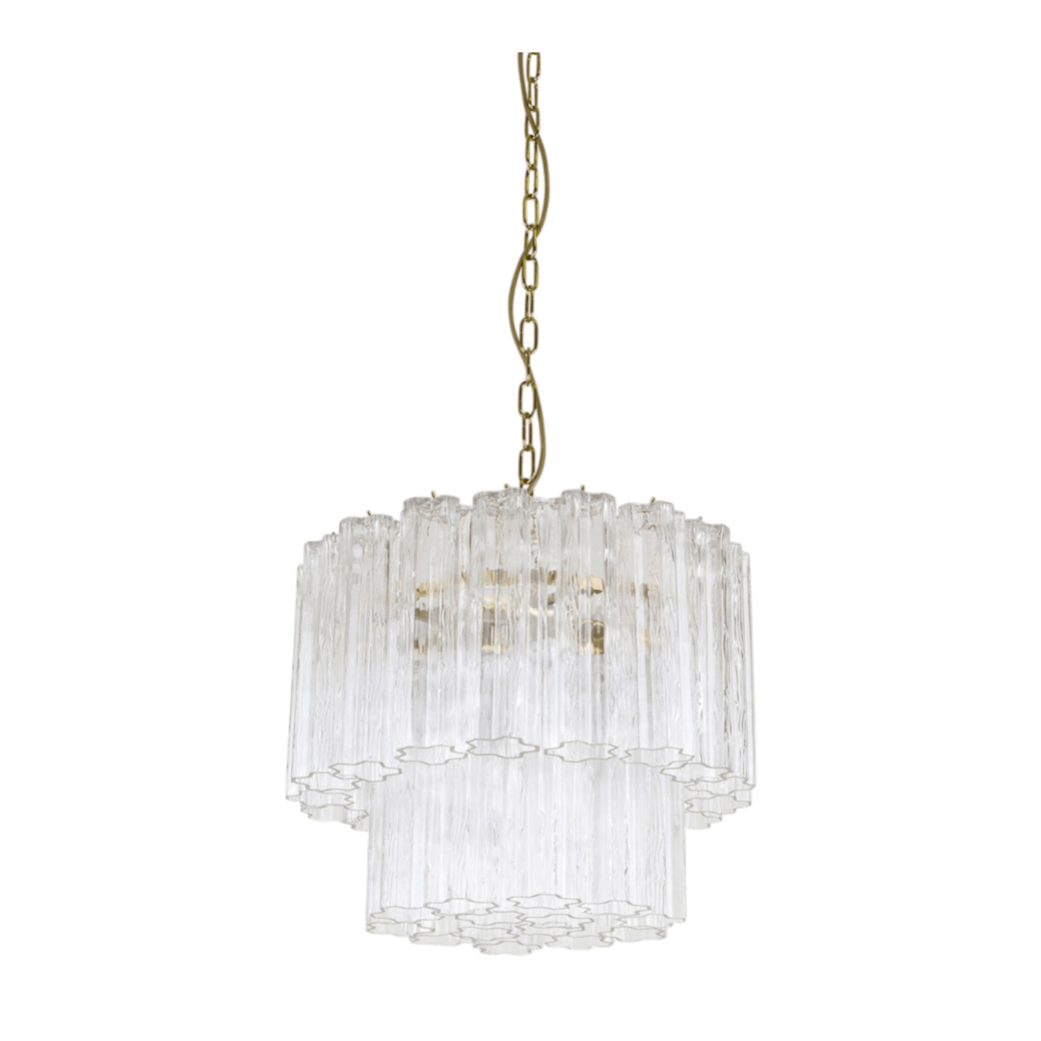 The Incantata Murano Small Treviso Chandelier by SMITH&SMITH features two tiers of fluted glass tubes that are inspired by refined mid-century design principles. The piece complements various interior aesthetics, making it a perfect choice for room transformations.
