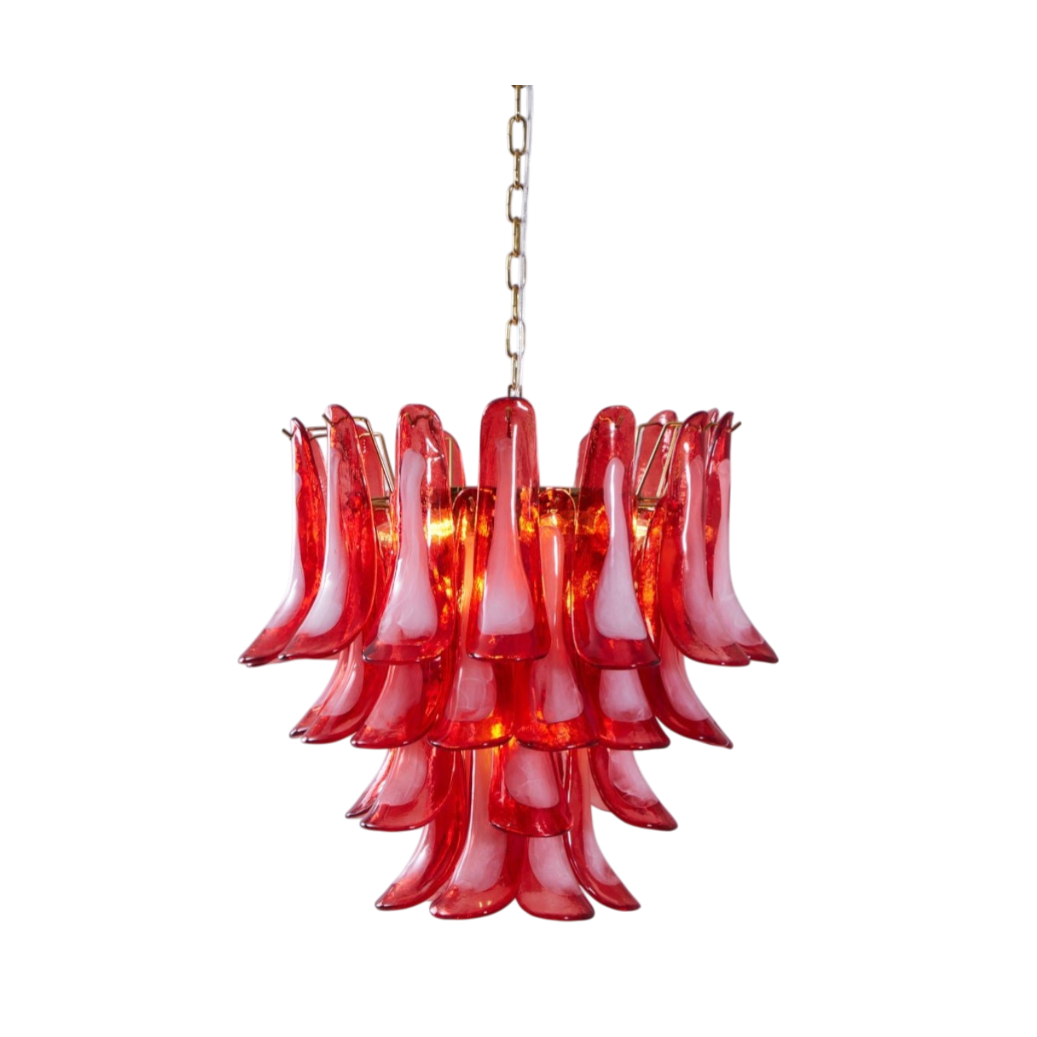 The Lucia Fiametta Murano Glass Chandelier by SMITH&SMITH features layered red glass shaped like soft flames. Its alluring feel is perfect for dining rooms or entryways.