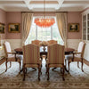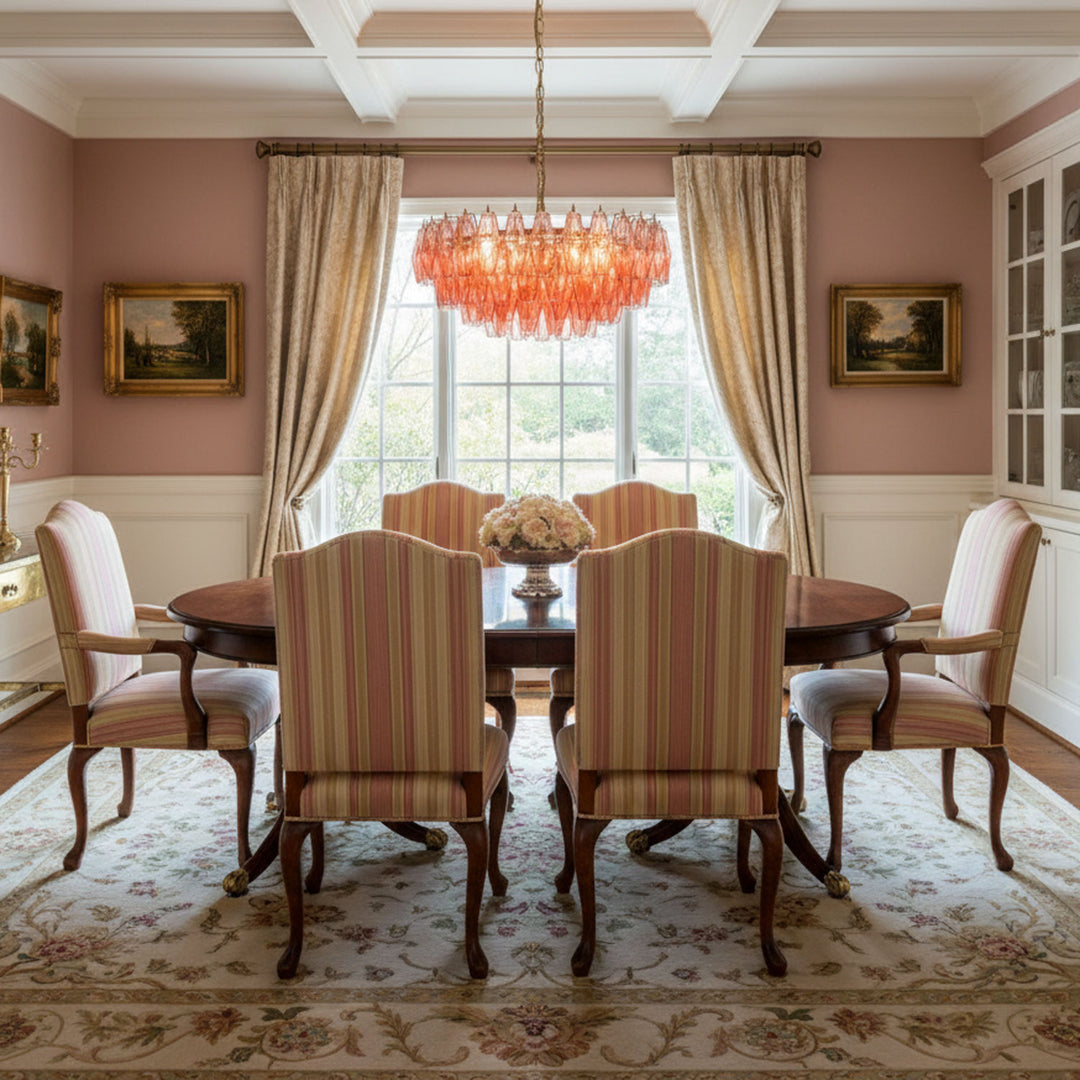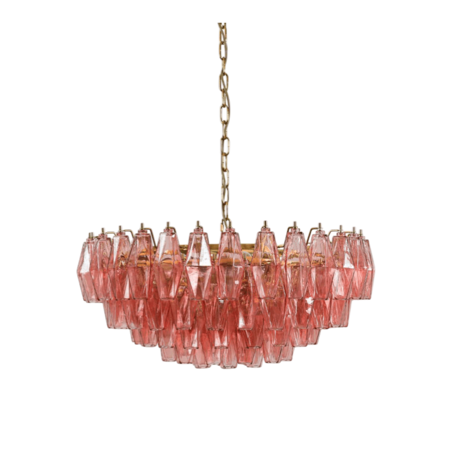 The Leanza Murano Polygon Drop Chandelier by SMITH&SMITH features architectural precision and artistic vision with the faceted polygon Murano glass. The geometric contrast of this piece brings elegance, perfect for modern dining areas or entryways.