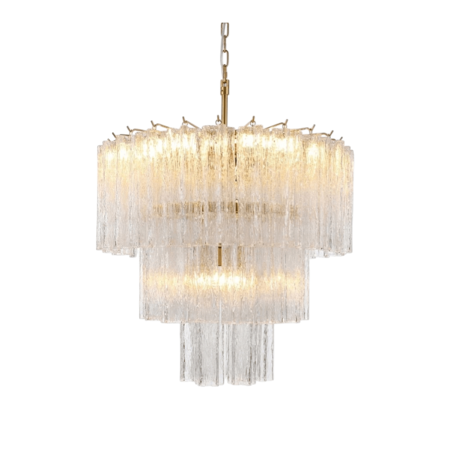 The Lia Murano Glacier Tier Chandelier by SMITH&SMITH brings a sculptural beauty to any space. Tiered glass prisms with the ice-textured finish bring elegance for the eyes. Its presence is perfect for dining rooms, entryways and living spaces seeking a modern and luxurious piece.