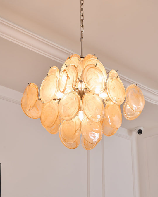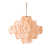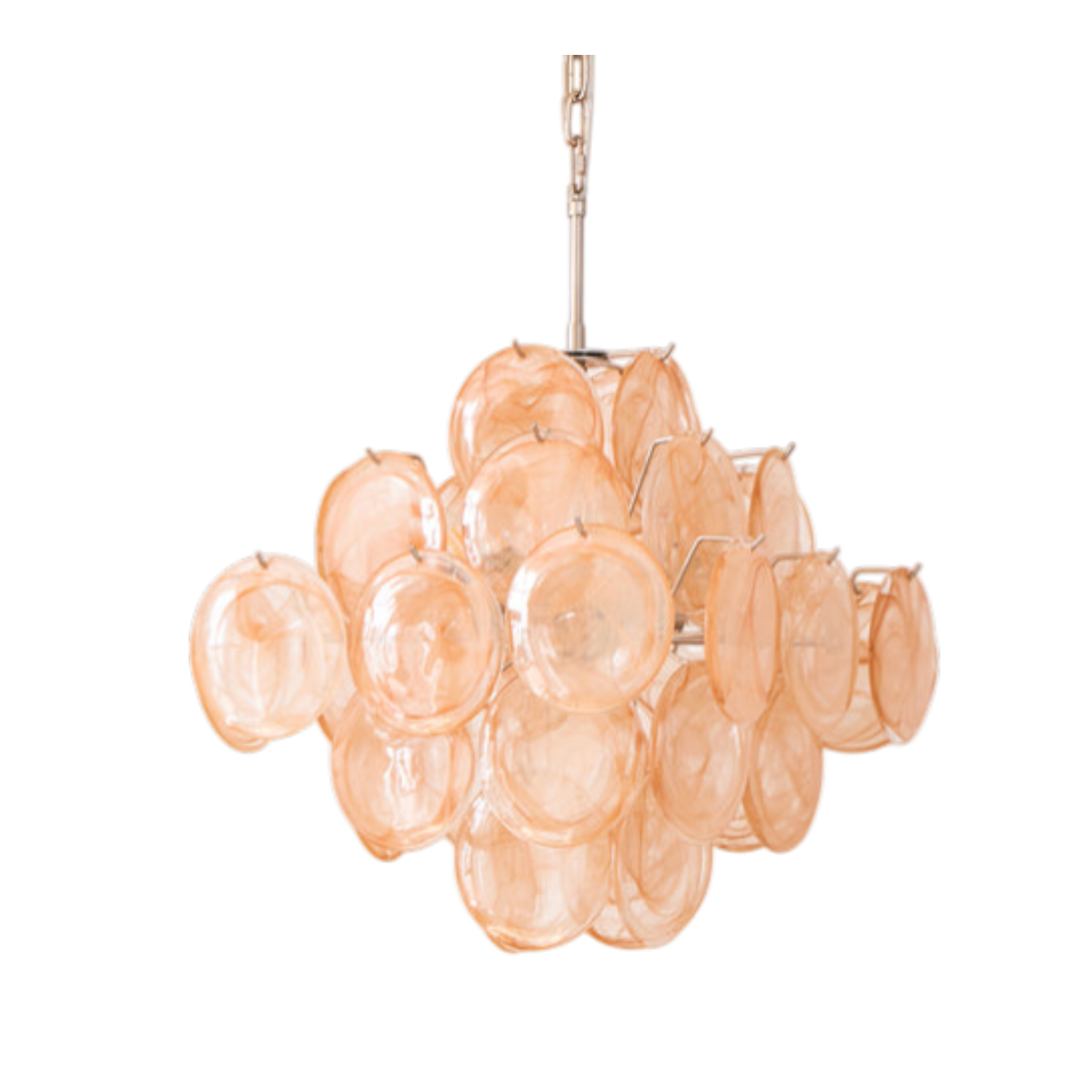 The Lorenza Apricot Murano Glass Chandelier by SMITH&SMITH features layered apricot glass discs in a handcrafted design. Its refined silhouette blends timeless Italian inspiration with modern style. Available in brass, nickel and selected other finishes. Contact us for more information.