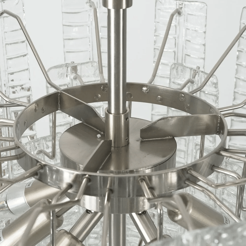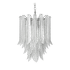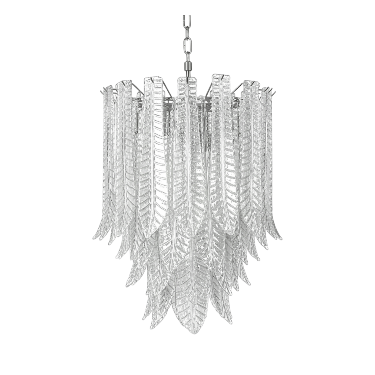 The Luminosa Murano Veil Glass Chandelier by SMITH&SMITH features cascading clear glass elements shaped like delicate leaves. The piece is formed with stunning clarity and architectural refinement, perfect for any space.