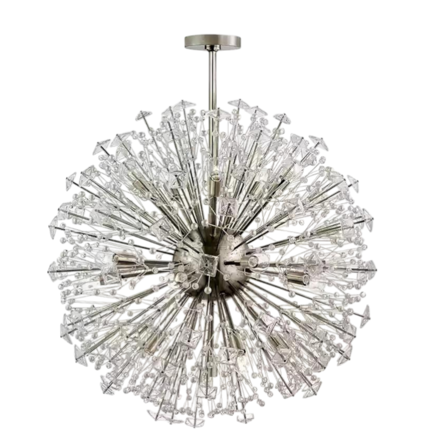 The Madalene Murano Dickinson Chandelier by SMITH&SMITH features a golden starburst design with crystal accents. It creates a warm, glowing light and comes in different styles. A striking piece for living rooms or entryways.