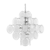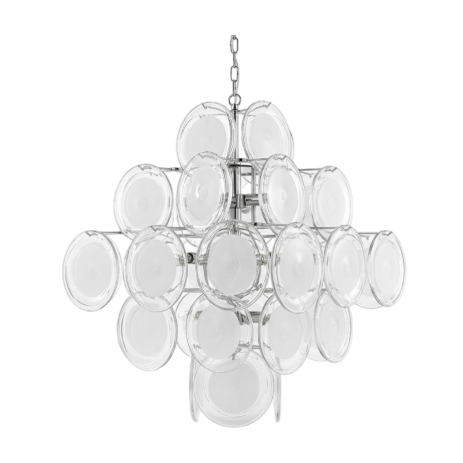 The Nico Murano Disc White Glass Chandelier by SMITH&SMITH features the timeless beauty of hand-blown Murano glass. Each disc is meticulously crafted to perfection. Discs reflect light and add a warm feel, perfect for modern living rooms, dining rooms, or luxurious lobbies.