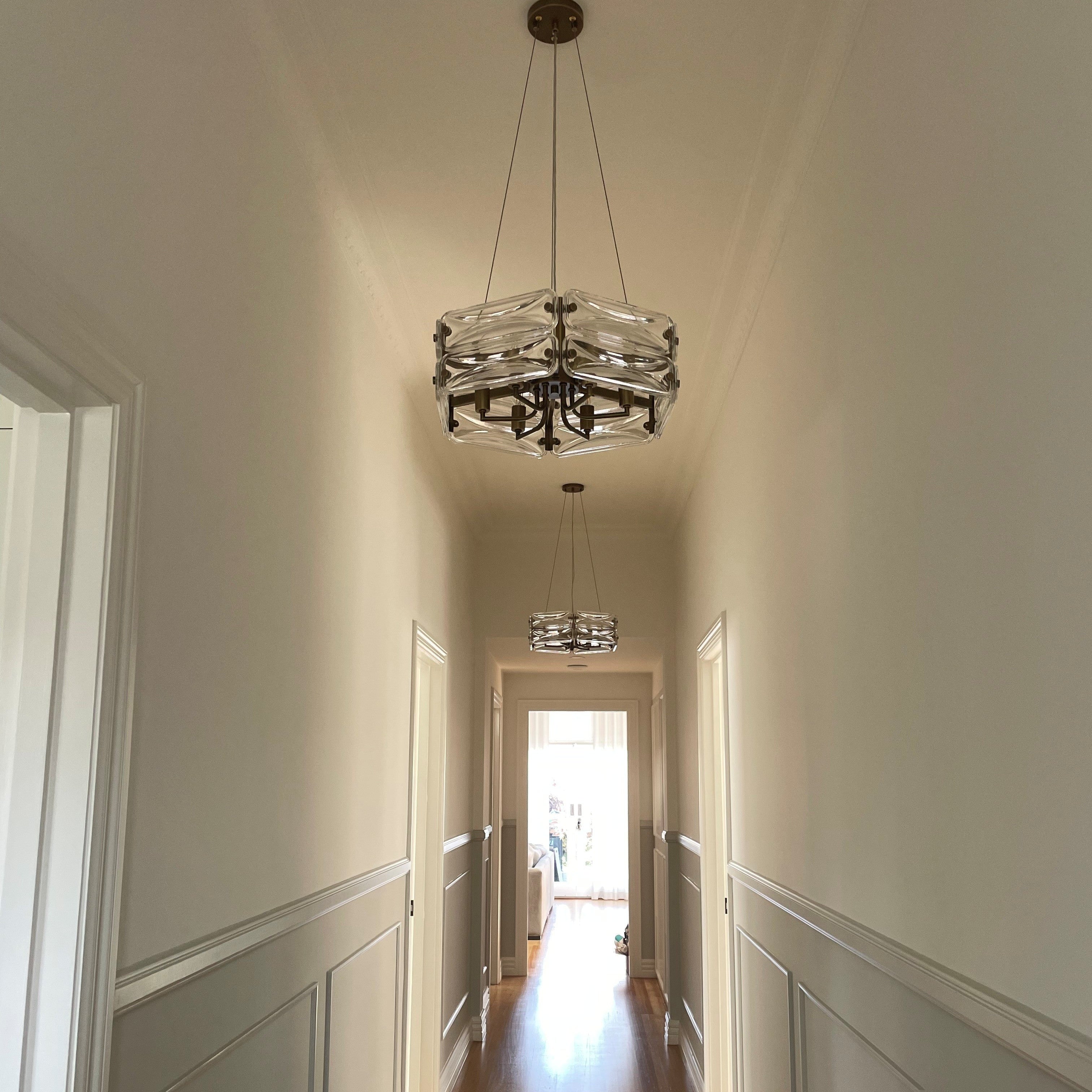 Made-to-order by SMITH&SMITH, this Noya collection is made from brass and high quality glass. This collection has a variety of chandelier sizes either suspended by flexible droppers or fixed rod. This collection is available as photographed in our brass finish, or in Antique Brass or Bronze. Other finish options are available for 10 or more pieces. This Noya style is also available as a ceiling lamp and in matching wall sconces.