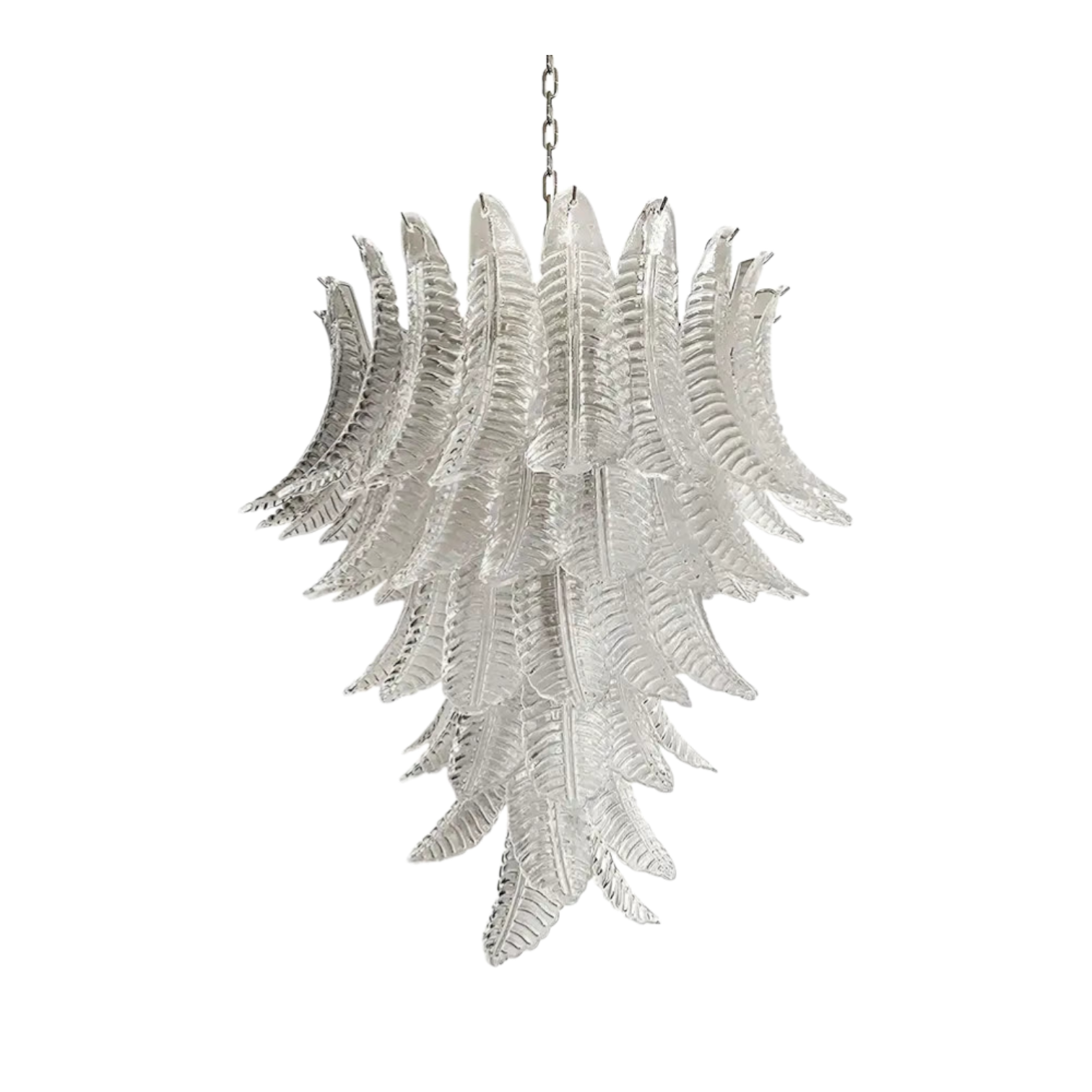The Ottaviana Murano Clear Glass Chandelier by SMITH&SMITH features delicate and captivating pieces of glass leaves meticulously arranged into a blooming floral cascade. The piece gives a soft, rosy glow, perfect for bedrooms or cosy living spaces.