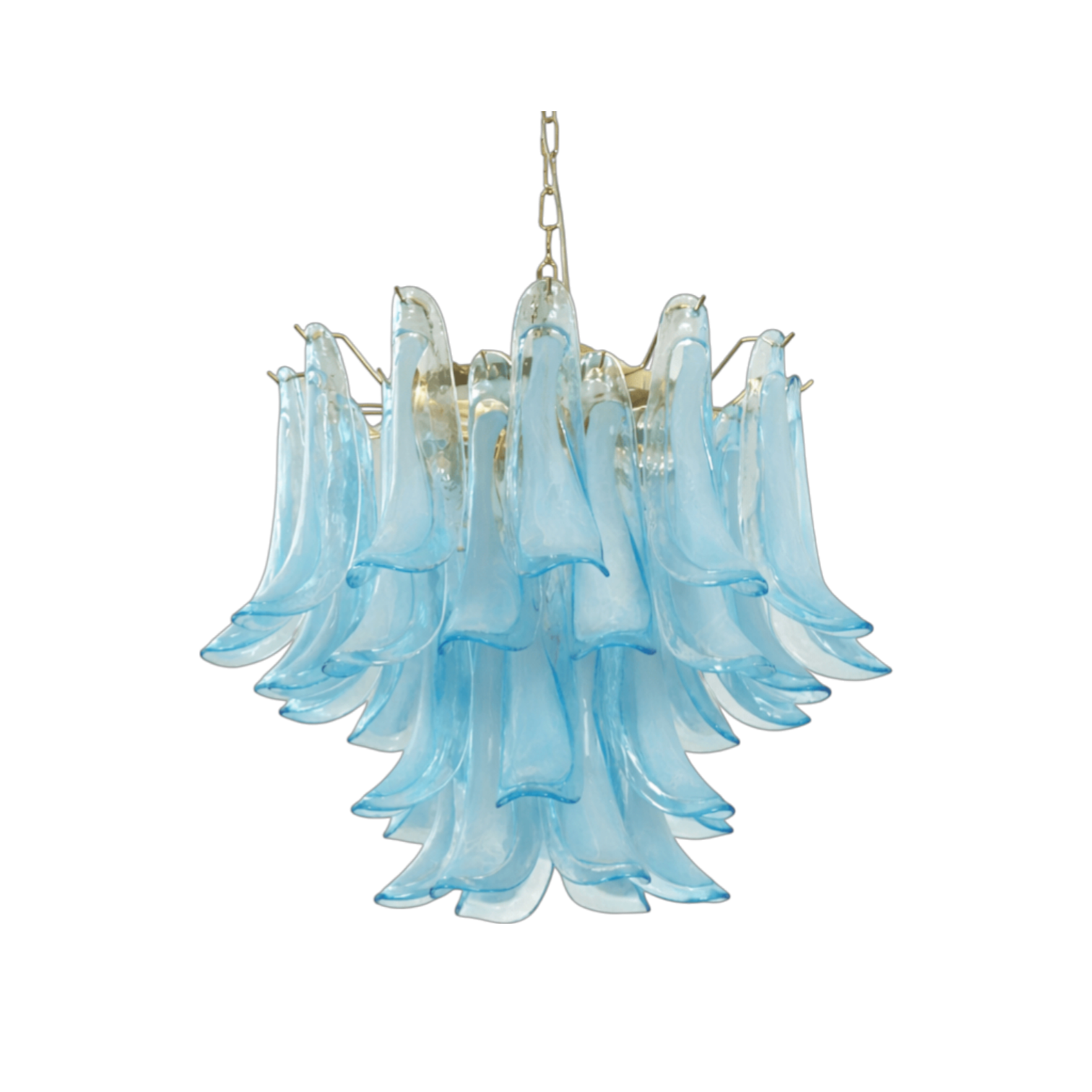 The Rachele Murano Glass Chandelier by SMITH&SMITH features layered, hand-formed glass that cascades gracefully like flowing water. Soft blue tones gently diffuse the light, creating a bright yet calming glow.