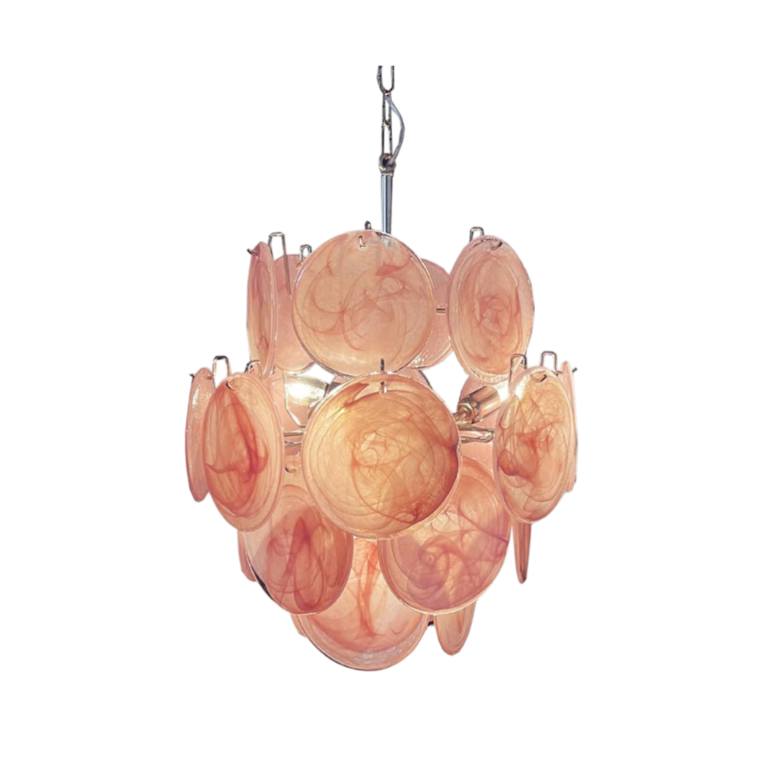 The Rici Pink Murano Disc Glass Chandelier by SMITH&SMITH features vintage charm and sophistication, giving a calming glow. The piece adds a touch of elegance, perfect for any space.