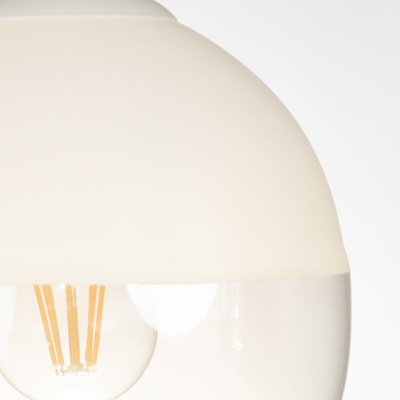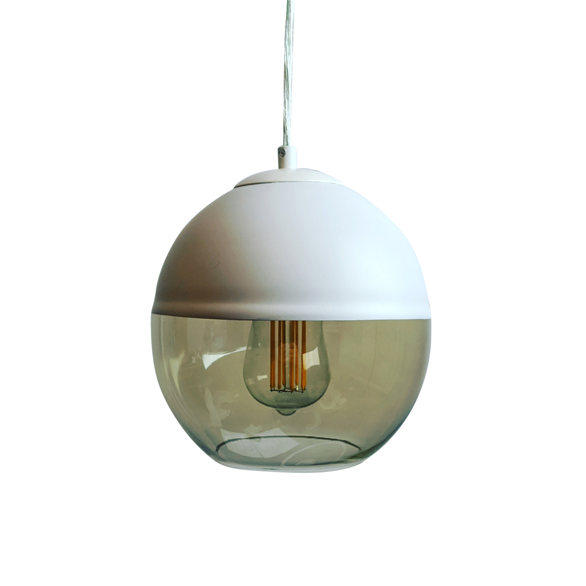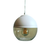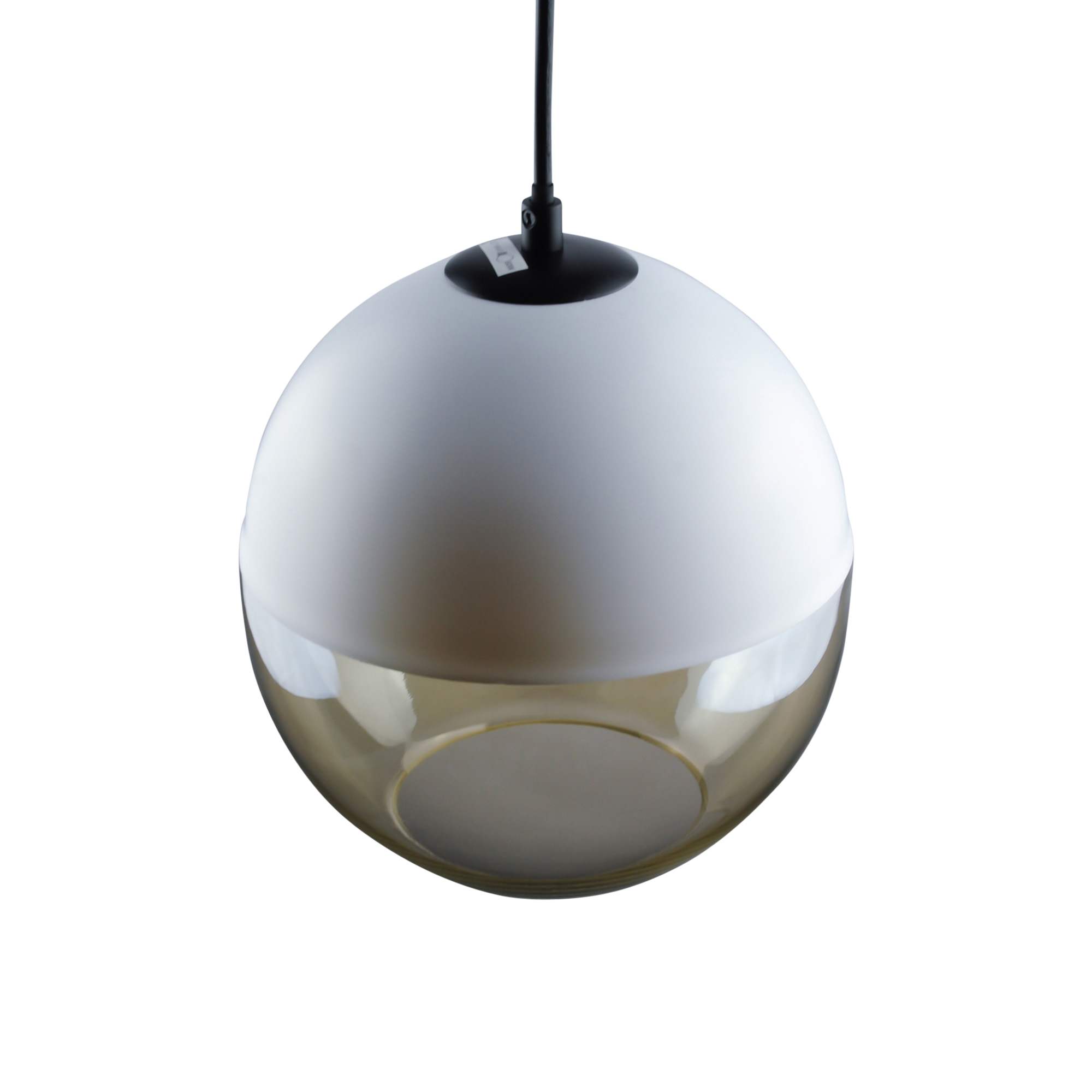 Our Roy pendant features a modern take on a classic design. With its round half matte-white top with lower half cognac hand-blown glass.