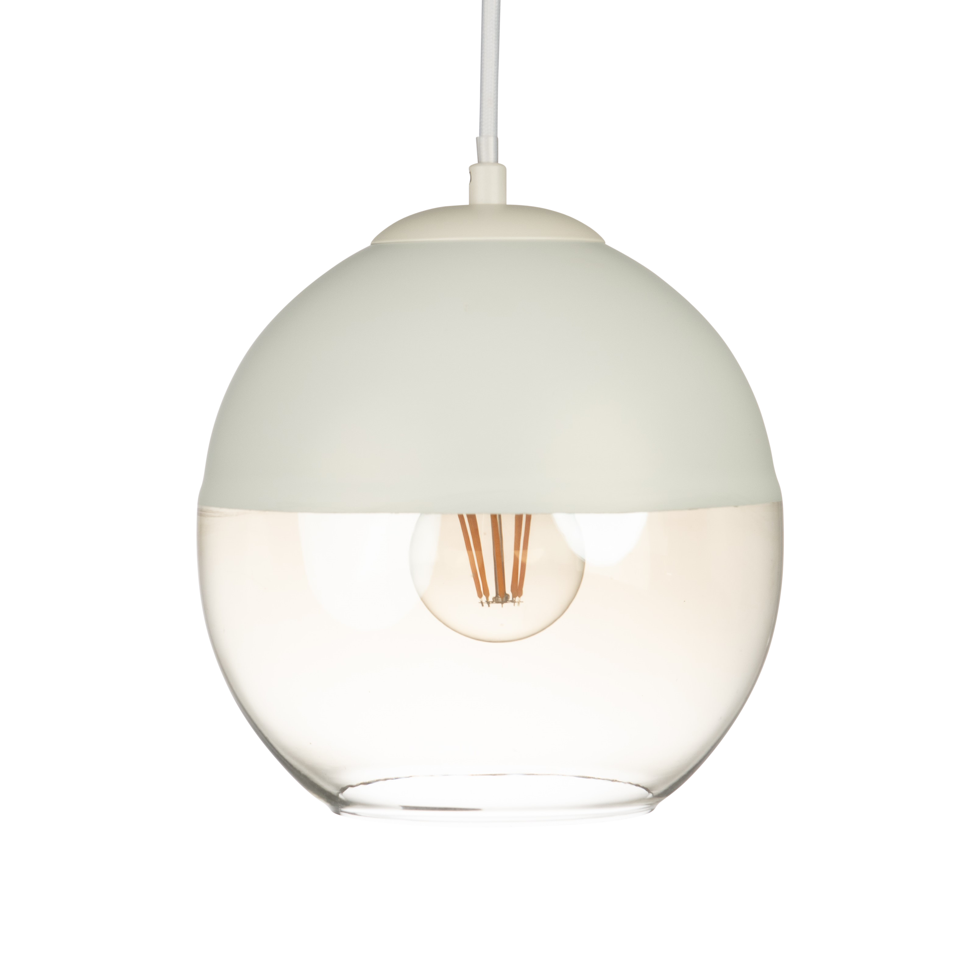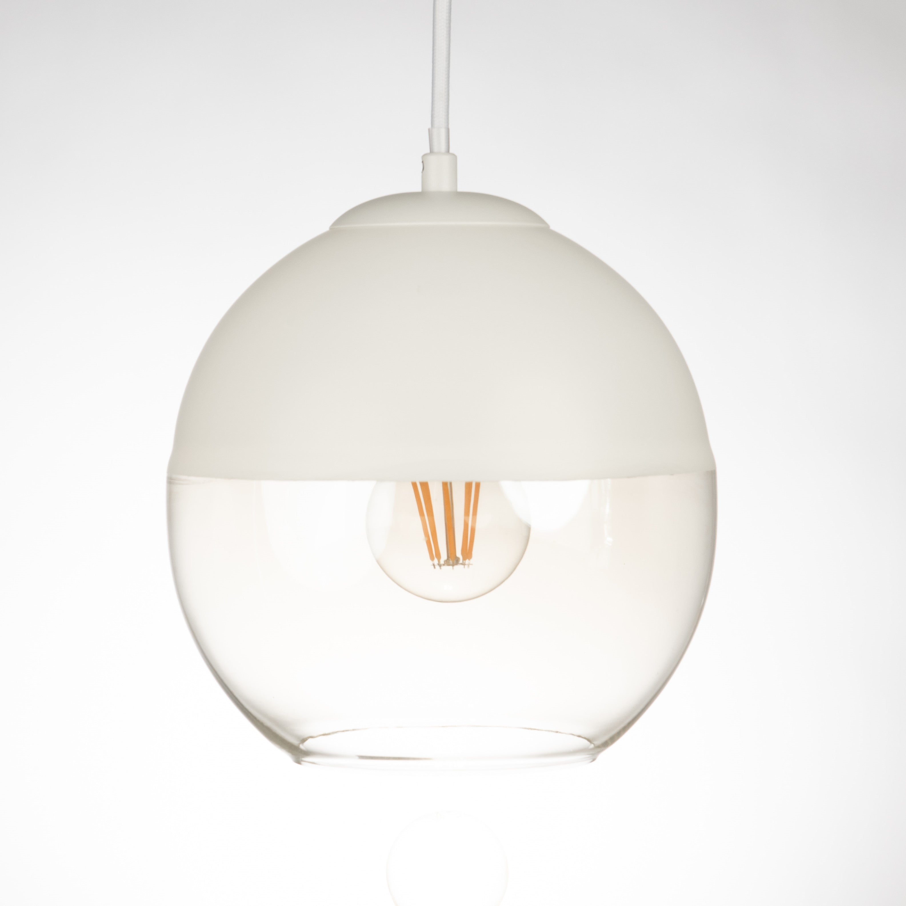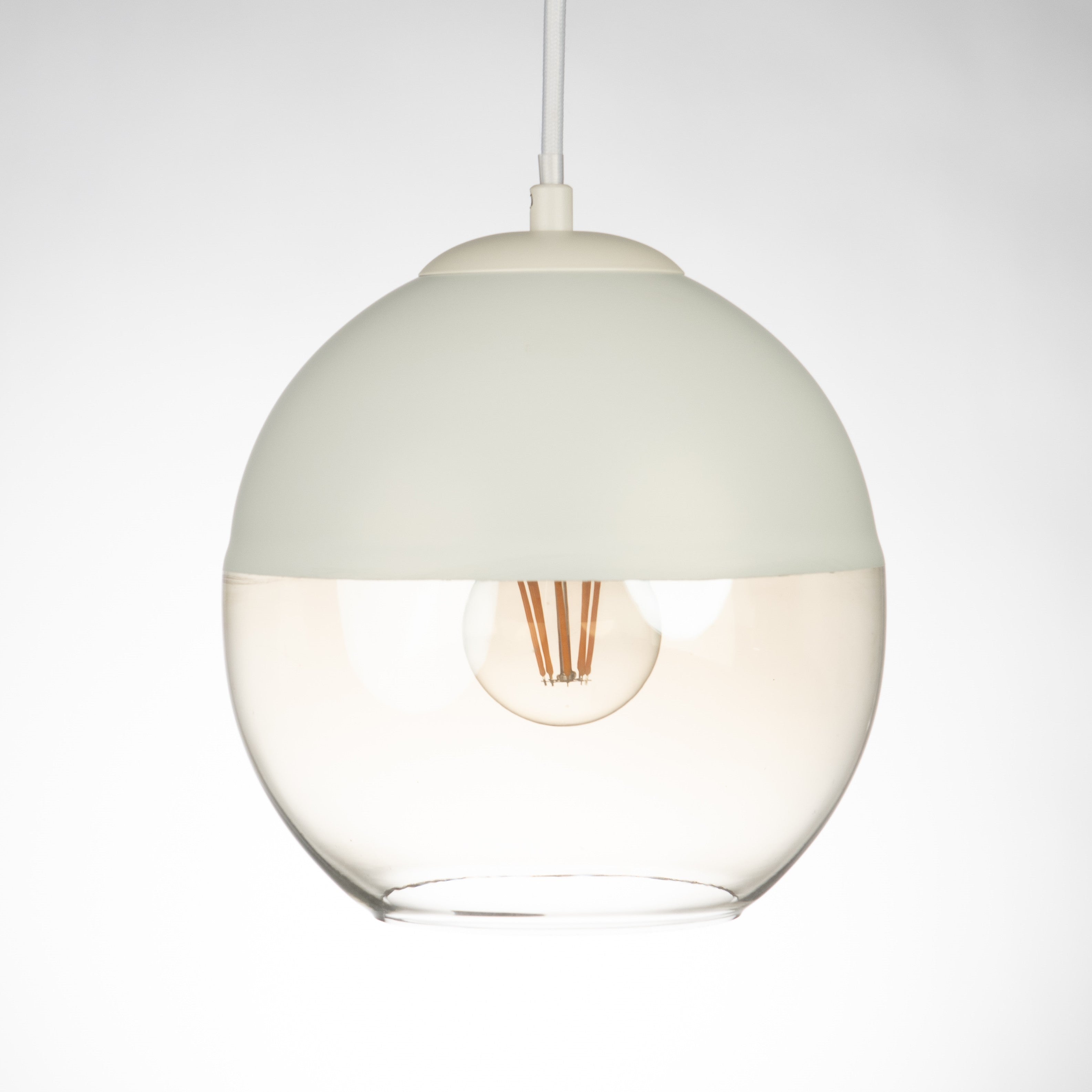 Our Roy pendant features a modern take on a classic design. With its round half matte-white top with lower half cognac hand-blown glass.