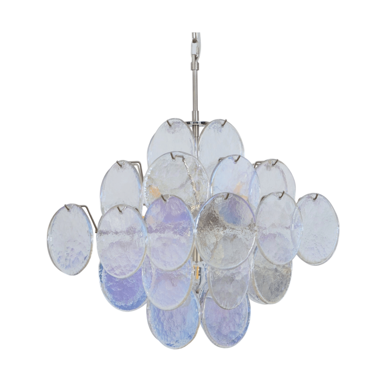 The Simonetta Murano Chandelier by SMITH&SMITH features handcrafted glass discs with a soft, iridescent finish. Each piece reflects light beautifully, creating a gentle glow with subtle tones of blue, green, and purple. A refined statement light that adds elegance to any interior.