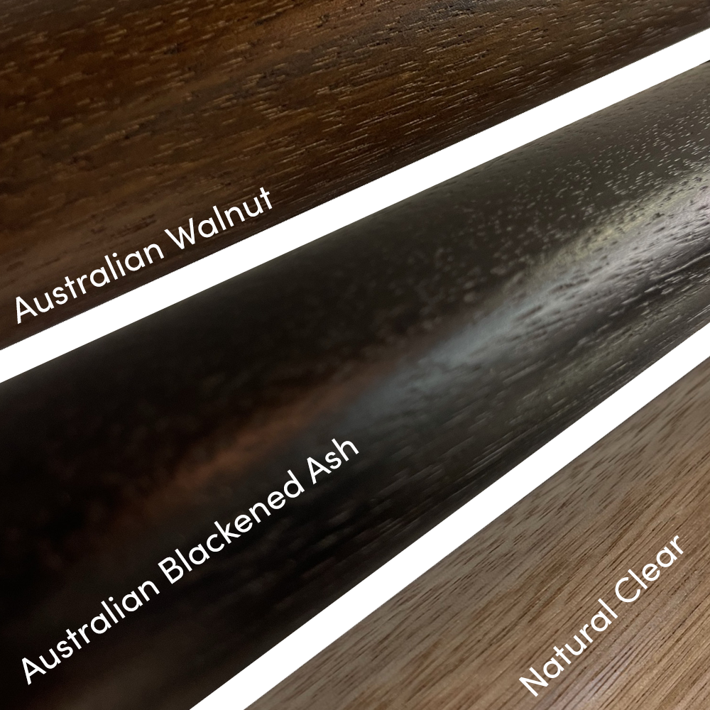 A. Contact us and we'd be happy to send you a sample. We finish the Simpson style in Natural/Clear French Polish, Australian Walnut or Australian Blackened Ash.