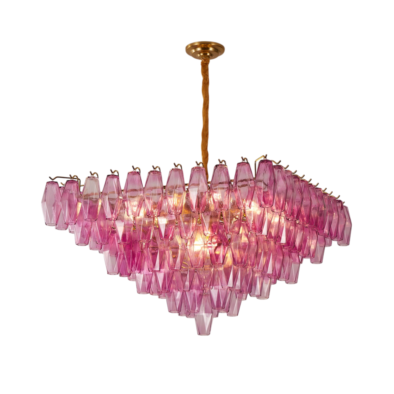 The Teresa Murano Prism Empire Chandelier by SMITH&SMITH features glamorous layers of fuchsia-toned glass in a cascading pyramid look. It instantly transforms any room into a luxurious and expressive space. It's perfect for modern foyers, dining rooms and lounges formed with a stylish approach.