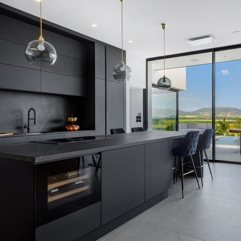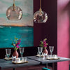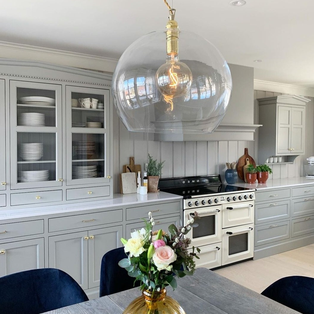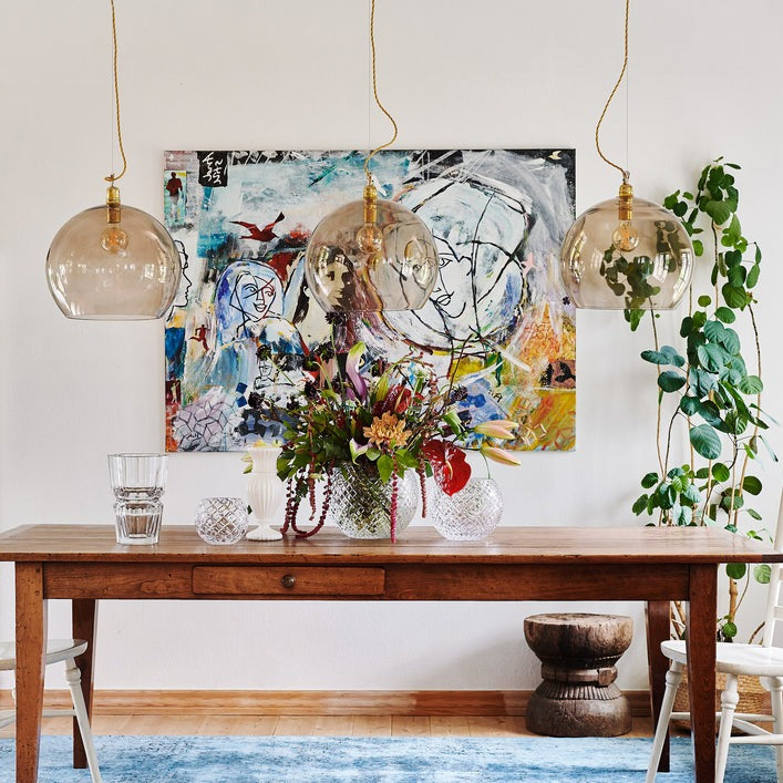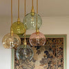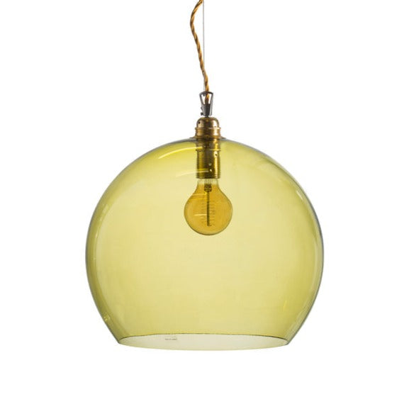 This classic round pendant lamp is available in numerous colours and sizes and is handmade from mouth-blown glass and assembled in Europe.